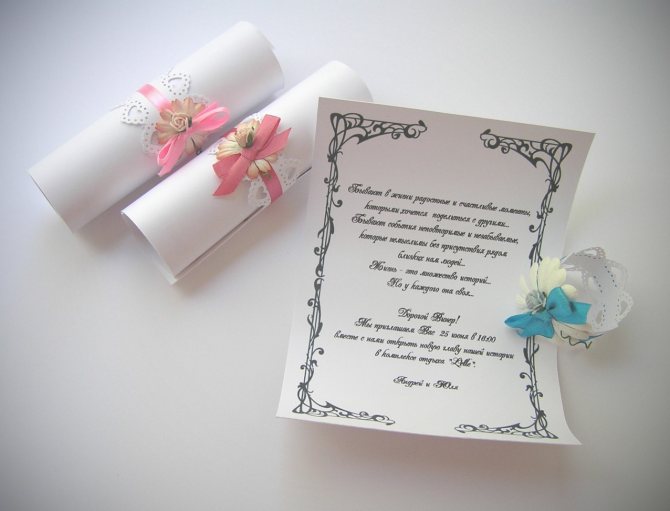 Для начала нужно определиться, какого размера будут пригласительные, и напечатать текст на бумаге. Цвета может быть любой. Обычно используют белый или пастельные тона. Но чтобы сделать красочные пригласительные можно использовать яркий картон или ленты. Для вырезания текста с бумаги лучше использовать специальные фигурные ножницы. Заем с помощью дырокола проделать отверстие для крепления бантика.