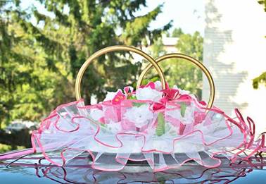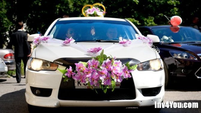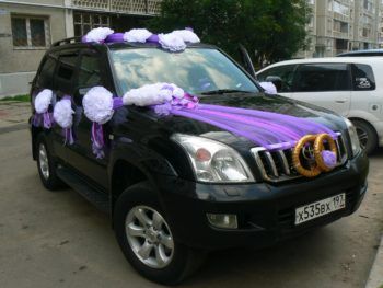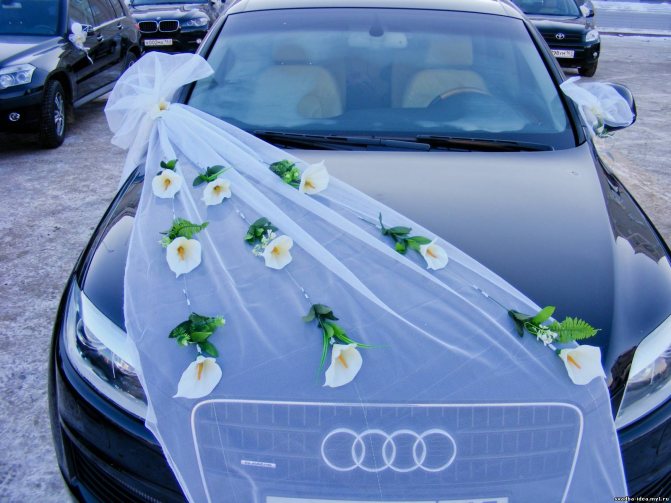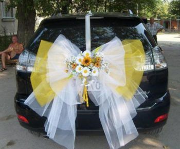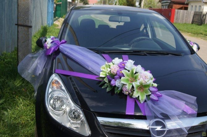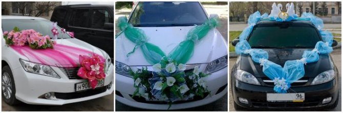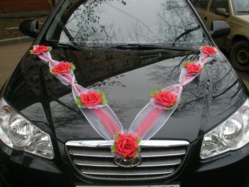 - нежные композиции из живых или искусственных цветов в сочетании с воздушным фатином, прикрепленные с помощью специальных присосок к капоту автомобиля;