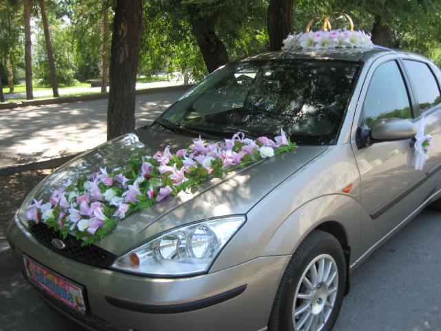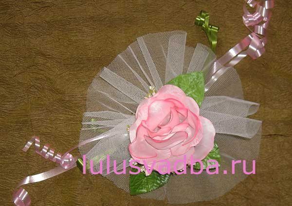 - одиночные цветочные элементы, закрепленные на атласных лентах капотов свадебных автомобилей;