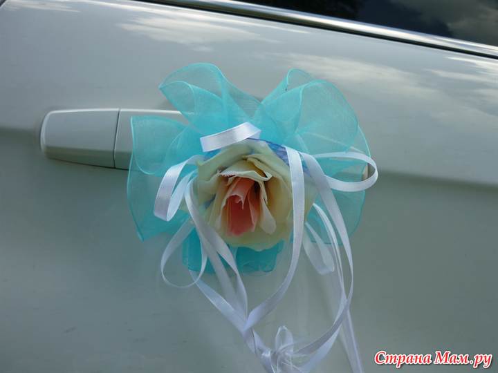 Ручки машин тоже можно украсить цветами, лентами и бантиками, следя за тем, чтобы они соответствовали основному украшению машины. Это видно на фото ниже.