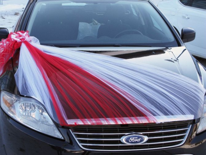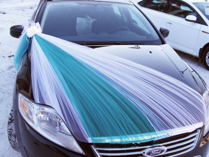 - Поместить полосу ткани на капот, зафиксировав её сверху и снизу. Из-за того, что материал не мнётся и держит форму, его чаще всего укладывают небольшими складками. Наиболее выигрышно выглядит, когда декораторы использовали два цвета фатина, которые наиболее сильно выделяются на фоне краски автомобиля.