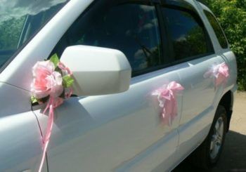 - небольшие цветочные композиции с бантами из атласных лент или белоснежным фатином, закреплённым на дверных ручках автомобиля;