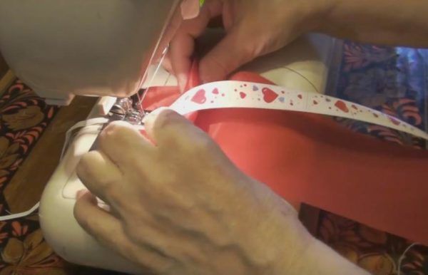 Для этого от края отступают 3 см и защипывают основную ткань. Она должна возвышаться над поверхностью примерно на 1–2 см. После этого укладывают верхушкой к себе и разглаживают сверху декоративную ленту. Теперь можно пришивать.