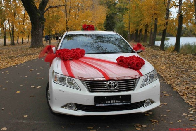 Каждую розу обвязывают воздушным бантом из невесомого белоснежного фатина или органзы и прикрепляют автомобильным скотчем к капоту, багажнику и крыше автомобиля.