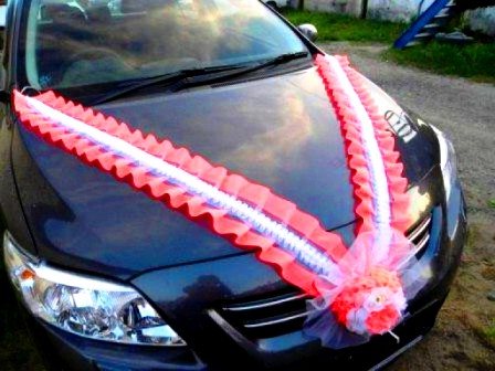 Лентами также можно обтянуть капот авто – от радиатора до зеркал. Их берут вдвое длиннее капота. К обоим концам ленты пришивают резинки, завязывающиеся под капотом. Для прочности закрепляют скотчем. Очень оригинально смотрится декорирование картонными бабочками, обшитыми атласной лентой собственными руками или купленными в магазине. Бабочек можно закрепить на капоте с помощью присосок или сплетенной собственными руками паутинки из ленточек-бабочек.