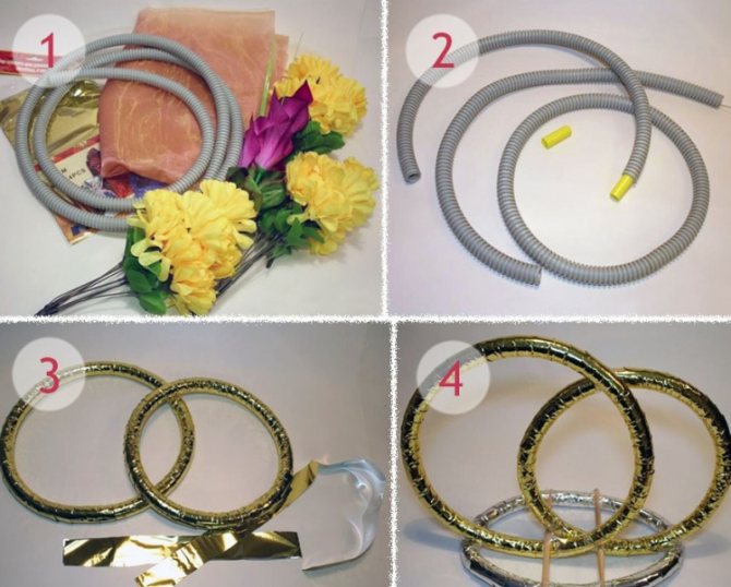 Из гибких шлангов делаются три кольца: два соединяются между собой, к третьему они крепятся. Но сначала их все нужно обмотать фольгой или лентой, затем уже хорошенько скрепить скотчем. Готовые кольца крепко-накрепко пришиваются к основанию, чтобы не упали в дороге. Основание драпируется тканью или цветами, на сами кольца можно повесить колокольчики.