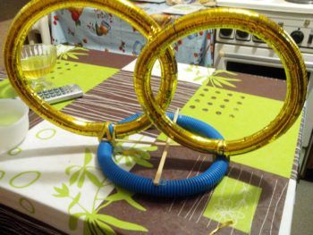 Для этого понадобится еще одно кольцо малого диаметра. Через его середину прокладывают металлическую линейку и прочно фиксируют с помощью суперклея. На данном этапе можно приступать к декорированию готовых колец.
