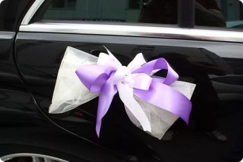 Большой красивый бант – украшение, которое крепится на капот или задний бампер автомобиля, а в центре машины его небольшие аналоги размещают на ручках авто.