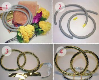 Редкая свадьба обходится без больших обручальных колец. Данный предмет декора также нетрудно сделать самому. Если вы не знаете, как сделать украшение на машину на свадьбу своими руками, то вот вам пошаговая инструкция. Вначале нужно приобрести материалы:
