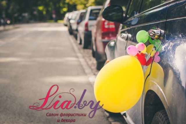 Можно сказать это классическое украшение машины. Самый бюджетный и простой вариант, но шары быстро сдуваются, лопаются и отрываются при езде машины, что также является главным минусом такого украшения. Привязывать шары лучше на ленту, если привязать их на нитку, то она может порваться сама или повредить шар. Если шаров несколько, то лучший вариант это сплести их хвостиками, а к ручке вязать лентой за “главный” узел, при этом сделайте несколько оборотов ленты и узел на самом хвостике и затем вяжите к ручке.