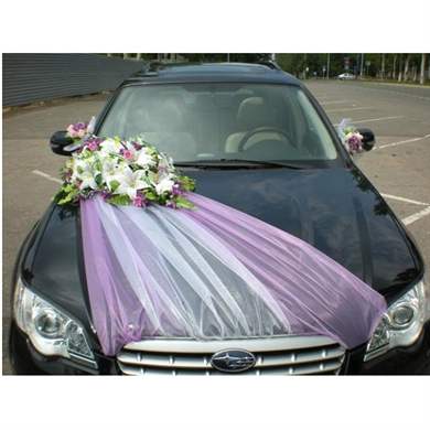 Украшение фатином – это новое модное веяние в декорировании авто. Вариантов как преобразить автомобиль, применяя материал, великое множество. Например, слегка приподнять край материала, сделав его похожим на фату или задрапировать фатином весь капот. Эффектно смотрится завязанный из ткани огромный бант. Сделать украшение в виде банта можно в тот же день, на который назначена церемония бракосочетания, поскольку это самый лёгкий способ декора. В любом виде, фатин как свадебная ткань, смотрится великолепно.