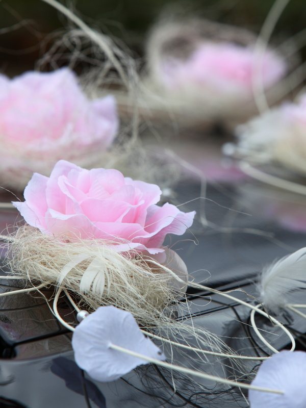 На капоте машины также будут хорошо смотреться композиции, сделанные из тканевых цветов. Живые цветы быстро вянуть и дорого стоят, зато цветы из ткани или лент можно заготовить и закрепить заранее.