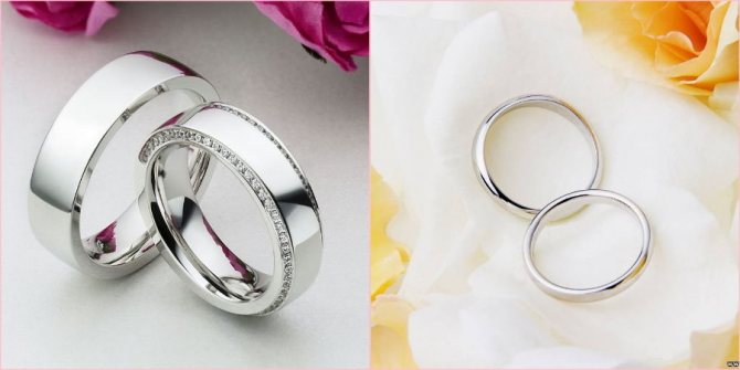 По дизайну они могут быть любыми, главное – идентичность. Если вы при этом хотите соблюсти и церковные обычаи, то допускается выбрать и разный металл: серебро для невесты, и очень бледное золото для жениха.