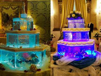 Самые оригинальные могут украсить торт при помощи аквариума с рыбками. Несколько аквариумов разных размеров стоят друг на друге, а десерт располагается по бокам.