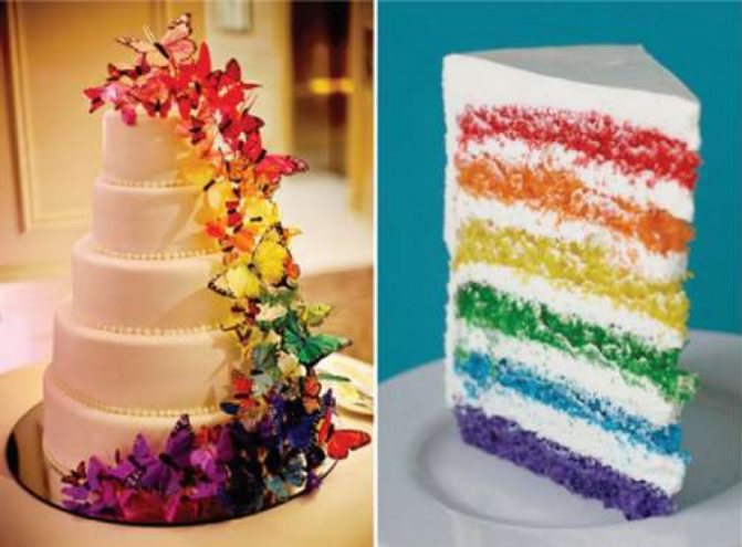 - торт с использованием коржей разного цвета. Это могут быть разные оттенки одного цвета или самая настоящая радуга;