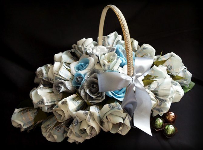 Живые букеты, хоть и красивые, рано или поздно засохнут и перестанут радовать. А вот оригинальный букет из денежных купюр не завянет. В Интернете есть множество примеров того, как можно красиво сложить банкноты в виде цветов. Даритель должен заранее рассчитать, какую сумму он собирается вручать и какой величины должен быть готовый букет. Чем он пышнее, тем больше купюр будет использоваться. Банкноты крепятся так, чтобы их можно было достать без особых проблем.