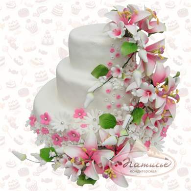 Для украшения подбираются такие же цветы, как и в букете невесты, Гармонично будет выглядеть цветочная композиция на торте в сочетании с цветами оформления зала для свадебного торжества.