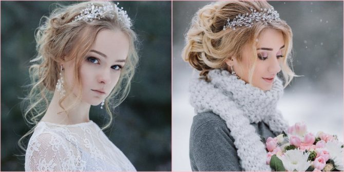 В качестве аксессуаров на голову уместно использовать хрустальную корону небольшого размера или диадему, блестящий ободок, гребень, красивые заколки и объемные венки.