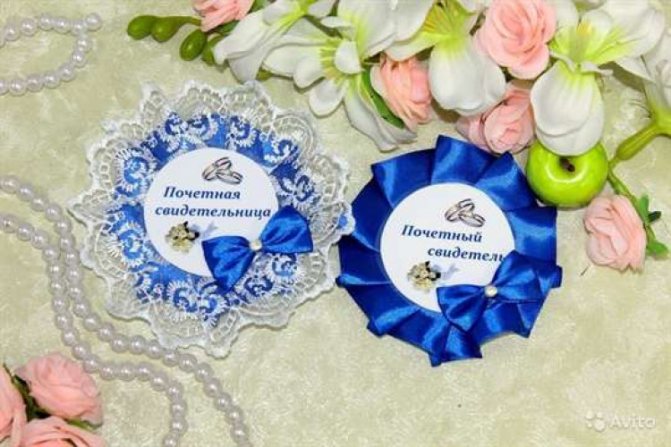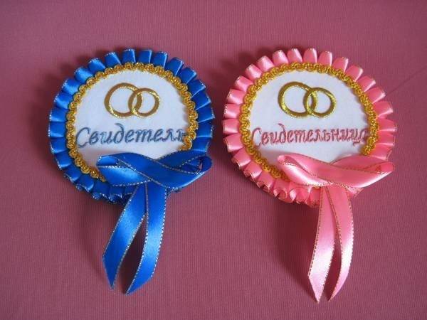 Ленты и значки для свидетелей своими руками — тоже отличный способ немного сэкономить свадебный бюджет, а также сделать именно то, что хочется видеть на празднике вам. Для начала необходимо найти в интернете или подготовить самостоятельно с помощью графического редактора шаблон значка для свидетелей на свадьбу — круглую картонную основу, на которой расположится текст, например: «Почётная свидетельница семьи Петровых». Затем необходимо запастись кружевом, тесьмой, красивой тканью, ножницами, клеем и специальными булавками.