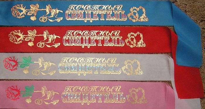 Многие молодожёны покупают своим свидетелям классические красные атласные ленты на свадьбу — это один из традиционных видов такого украшения, которое обычно сопровождается золотой надписью «Почётный свидетель» или «Почётная свидетельница». Современные свадебные салоны предлагают сегодня самые разные оттенки ленточек ¾ это и насыщенный индиго, и нежный розовый, и актуальный в этом сезоне лавандовый. Кстати, интересным вариантом является лента для свидетелей на свадьбу в виде триколора — она смотрится особенно торжественно.