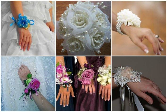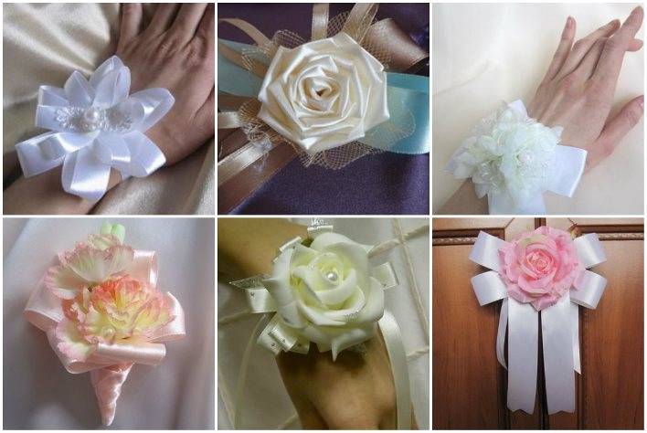 Самые популярные композиции, которые подружки невесты надевают на руку, составляются с помощью искусственных или живых роз. Нередко девушки делают для свадьбы бутоньерки своими руками, используя для реализации творческих идей декоративную проволоку, ткани, бисер, атласные ленты. Часто материалы подбираются в зависимости от сезона, в котором проводится свадьба. Например, осенью оригинальную свадебную бутоньерку составляют в композиции с сухими листьями, желудями и небольшими овощами.