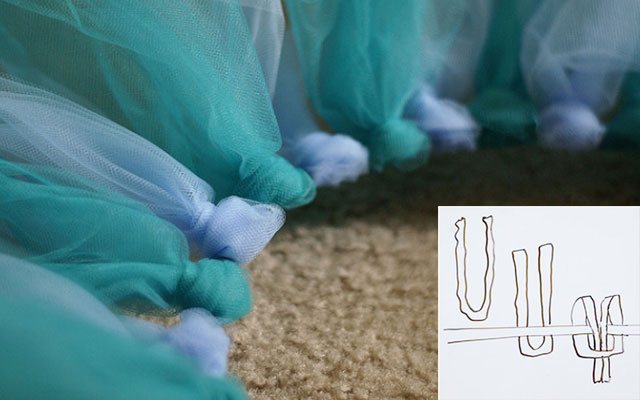 Сделать ее не сложно. Для этого нужно взять резинку нужно размера и прикрепить ее к стульям, далее крепить к ней ленты фатина, как на фото: