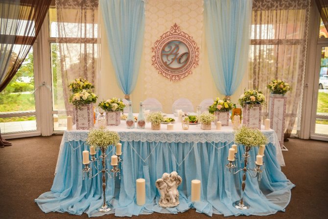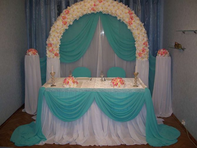 Оформление стола молодоженов для церемонии бирюзового бракосочетания.
