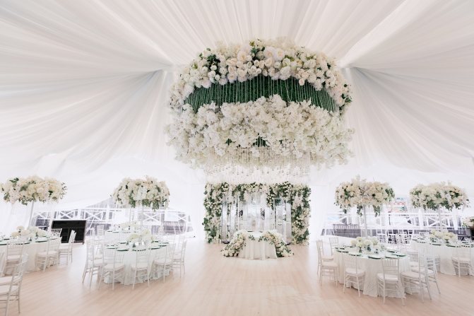 Драпируют тканью не только стены банкетного зала, но и потолок, создавая своеобразный свадебный шатер: