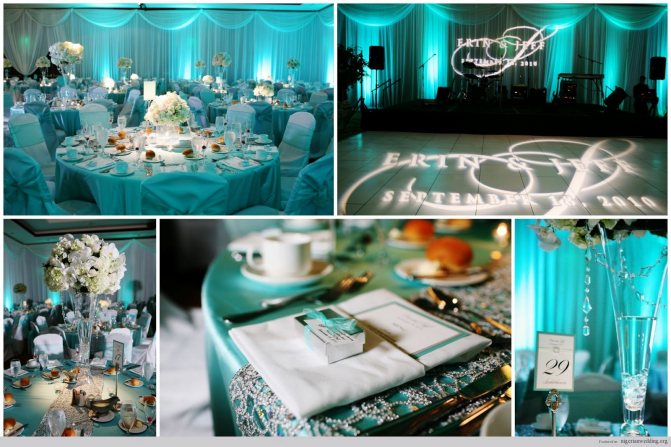 Идея оформления банкетного зала. Бирюзовая свадьба.