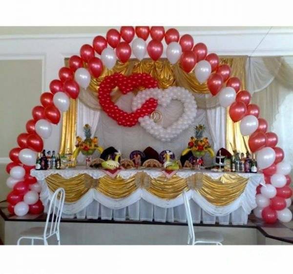 Воздушные шары. Крепятся на металлическую и деревянную конструкцию, предварительно декорируемую тканью. Можно выбрать шары схожих оттенков, можно сыграть на контрастах – решение должно базироваться на стилистике вашего торжества;
