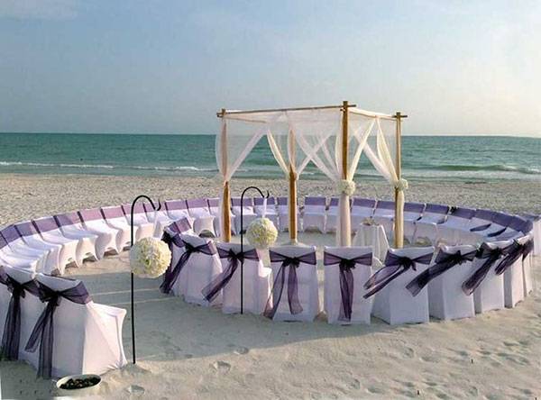 Если свадьба ориентирована на определенную тематику – в оформлении арки следует предусмотреть элементы, соответствующие ей. Например, для торжества в морском стиле арку можно украсить длинными зелеными лианами, синими лентами, полупрозрачной органзой голубого и бирюзового цвета, морскими звездами, ракушками и цепочками из жемчужных бусин.