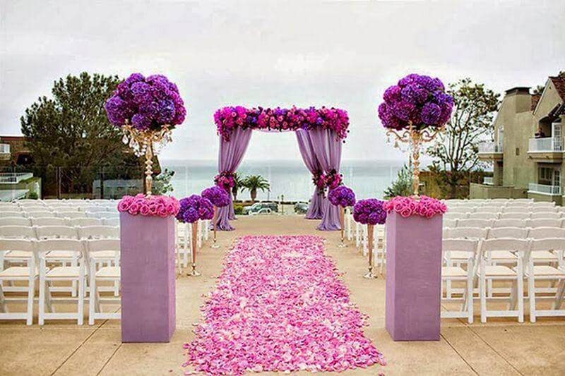 Проход к арке принято оформлять дорожкой. Это может быть красная, белая, цветная текстильная, декоративная дорожка (например, вымощенная из деревянных дисков), лепестки роз. Последний вариант особенно хорошо подойдет для выездных регистраций в лесу, на лужайке, где нет ровной поверхности, на которую можно было бы расстелить ткань. Оградить дорожку от стульев гостей можно тканевыми драпировками, специальными столбиками, которые дополнительно украсить букетиками цветов, лентами, бантами, свечами в оригинальных подсвечниках.