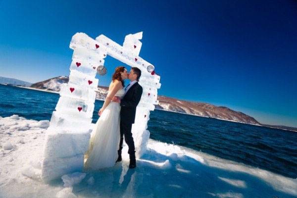- Лед и стекло. Интересно, но в зимнее время года возможностей создать что-то уникальное ничуть не меньше, чем весной или летом. Конечно, церемония будет непродолжительной, зато интригующей и эксклюзивной! Из глыбы льда можно создать необыкновенной красоты арку! Здорово смотрится и стекло – всевозможные подвески и небольшие фигурки будут переливаться в лучах солнца и создавать радужное настроение;
