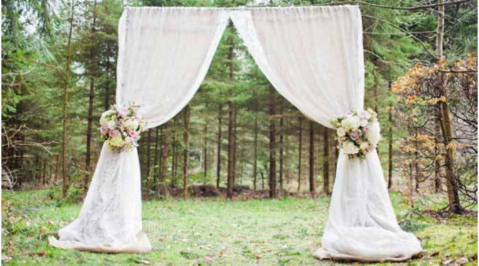 - Текстилем. Выбирайте ткань, исходя из тематики торжества: если вы планируете спокойное и лёгкое торжество, то для арки выбирайте летящие ткани (например, органза или вуаль), а вот для свадьбы в стиле рустик прекрасно подойдёт натуральный ситец. Свадебная арка из ткани также может быть выполнена из шёлка, ткани с орнаментом, портьерного материала, бархата и т.д. Главное, чтобы текстиль соответствовал стилю торжества и был по вкусу паре;