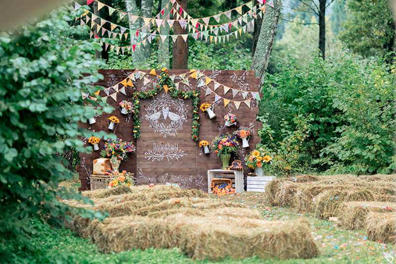 Для свадьбы в стиле эко или рустик стулья можно заменить на снопы сена, пеньки, бревна. В бохо это могут быть небольшие лавочки с множеством пестрых подушек или просто яркие пуфы.