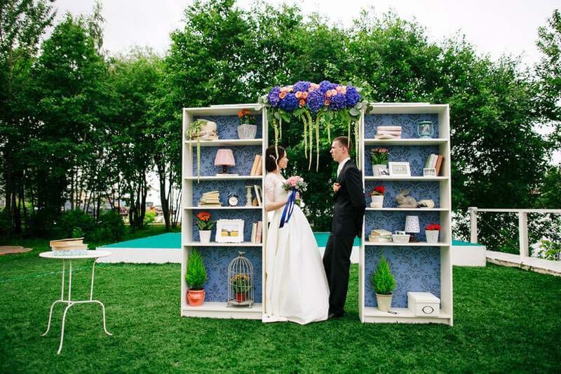 Что если арка будет из плетеных веток, бамбуковых палок, стопок книг или вообще отдельно стоящим проемом с распахнутыми дверями? Чем неожиданней предметы, тем интереснее. На самом деле, все ограничивается только вашей фантазией, и заданной тематикой торжества.