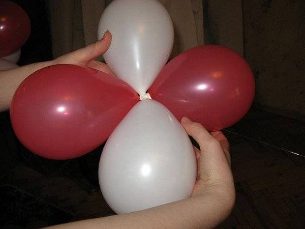 Это просто – нужно связать между собой 4 шарика. Берем 2 шара и скрепляем их друг с другом «хвостиками» с помощью лески. Затем такое же действие производим с другой парой шариков.