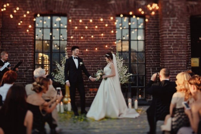 Торжество Анастасии и Мирослава сочетает в себе урбанистический стиль и вечную классику. За основу концепции они взяли ретро-комиксы и фильмы о супергероях. В качестве площадки был выбран лофт, в центре которого и установили конструкцию, сделанную на заказ. Рядом поставили вазы и инициалы молодоженов.