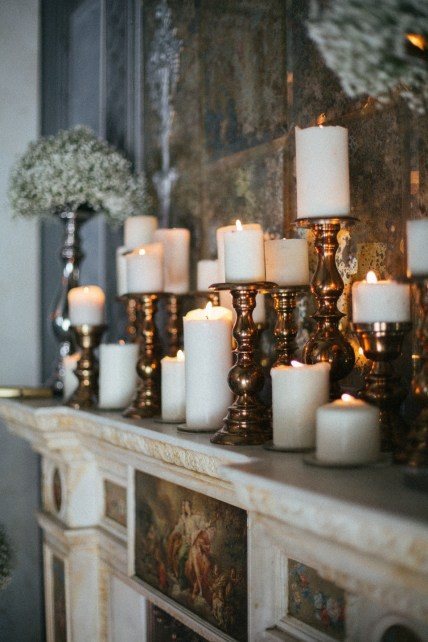 Свадьба Сергея и Альбины была оформлена в классическом стиле, а ее главной деталью стал большой белый камин, на фоне которого и прошла их регистрация. Дополнили его большими свечами в подсвечниках и высокими стеклянными вазами с ветками гипсофилы.
