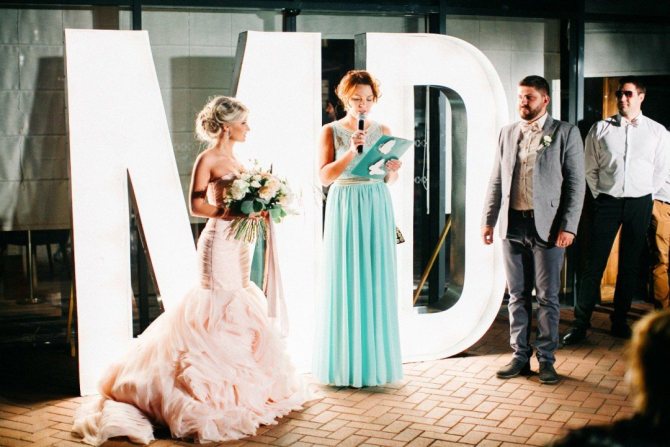 Дмитрий и Марина изначально решили, что свадьба — это самое яркое, блистательное и незабываемое событие в жизни. На свадьбе в европейском стиле Urban chic с нотками гламура центральной фигурой стала арка, выполненная в виде огромных объемных букв — инициалов жениха и невесты на английском языке. Именно на их фоне они и произнесли свои клятвы.