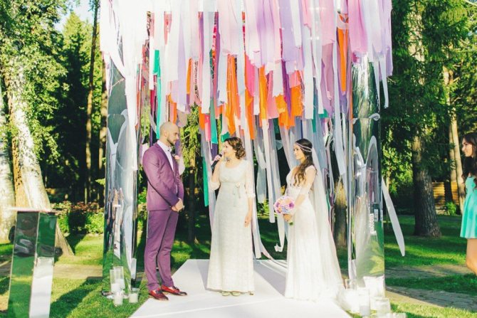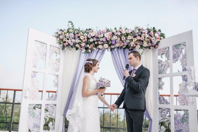 При оформлении праздничных арок ничто не ограничивает фантазию будущих супругов. В основе декора могут быть использованы воздушные шары, текстиль, всевозможные фигуры, дизайнерские стойки, ленты.