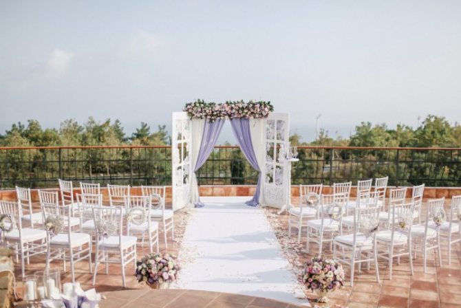 Свадьба Кирилла и Елены на берегу Черного моря в солнечном Гурзуфе как нельзя лучше символизирует начало новой жизни. Ведь ребята оформили свадебную арку в виде открытых дверей с шапкой из цветов нежных оттенков. Шторки фиолетово-сиреневого оттенка напоминали, что это праздник двух влюбленных сердец.