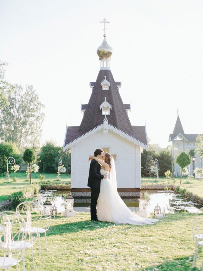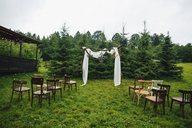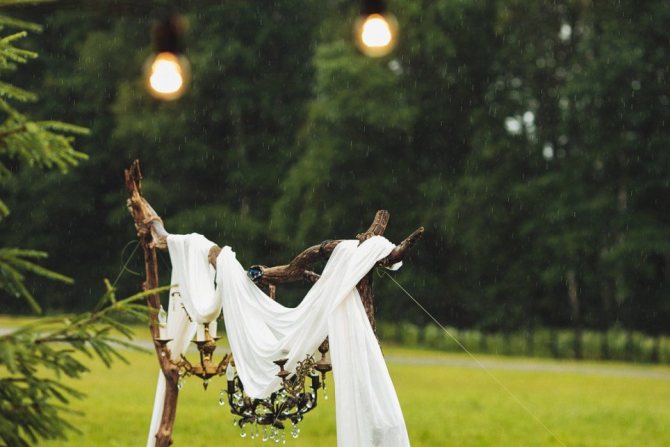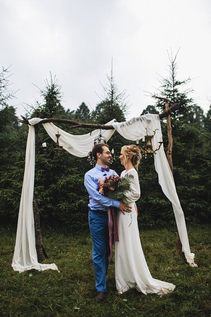 Геологи Вадим и Катя сразу решили оформить свадьбу, используя натуральные цвета. Свадебную арку они сделали в том же стиле — конструкция из деревянных палок была украшена шелком, массивными подсвечниками и люстрой с хрусталем. Внезапный дождь лишь добавил церемонии волшебства!