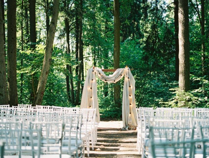 Текстиль в декоре свадебных арок выглядит более чем уместно. Из тканей лучше всего подходят легкие, летящие с полупрозрачной фактурой:
