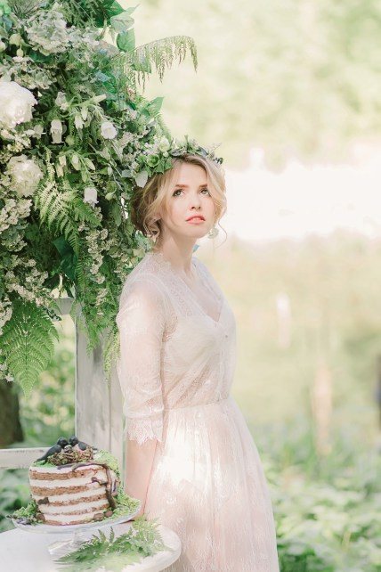 Выбранный стиль фотосессии «Лесная свадьба» подразумевал наличие в декоре мха и других растительных, «лесных» элементов. Для регистрации была выбрана потрясающая лесная локация в черте города, украшением которой стала арка, выполненная в виде вертикальных цветочных композиций в горшках.