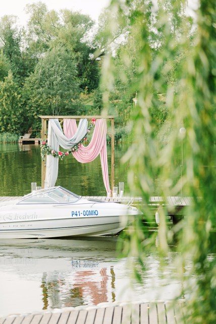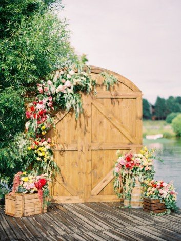 На летней свадьбе Леши и Ники в стиле рустик в уютном месте на Пироговском водохранилище роль арки с успехом исполнила дверь, установленная на пирсе и украшенная цветочной гирляндой. Цветы стояли и по бокам — на деревянном ящике и бочке. Посмотрите, как стильно это выглядело!