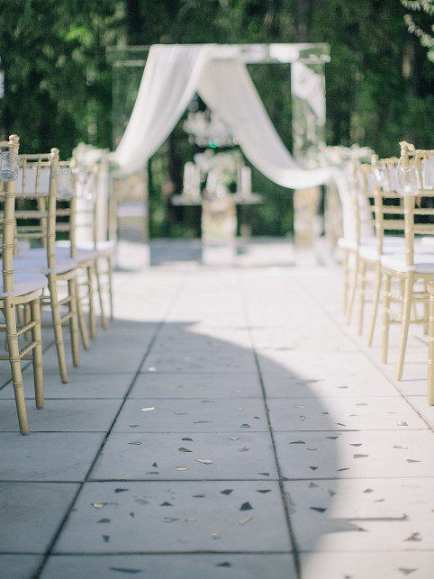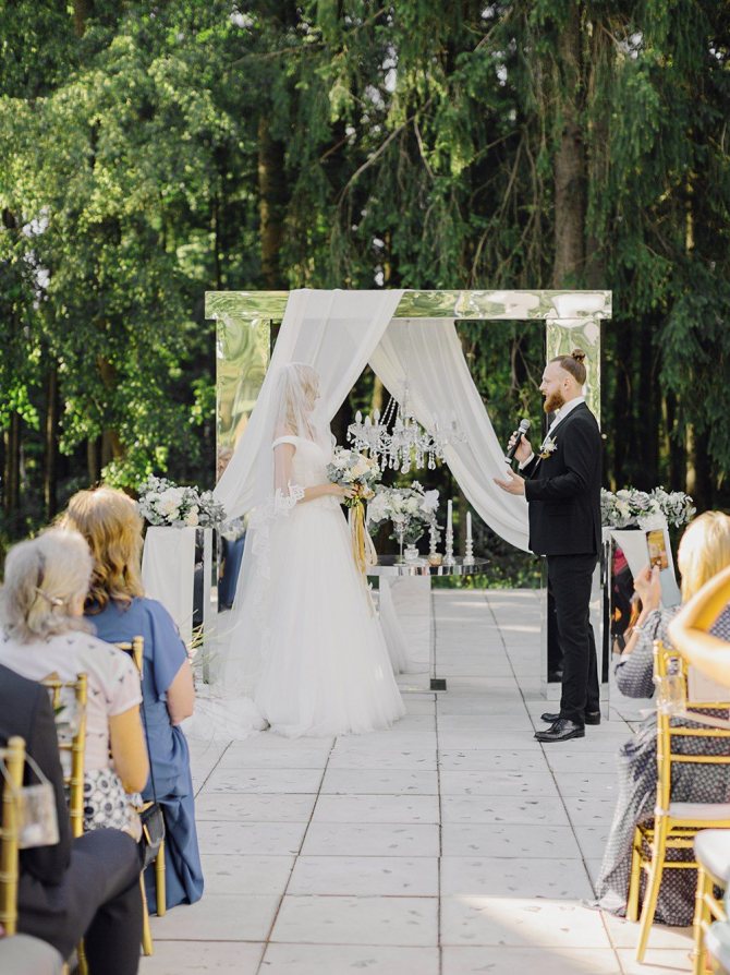 Праздник Катерины и Андрея, который соединил в себе легкость, искренность и эмоциональность его главных героев был украшен необычной свадебной аркой. В качестве арки была использована зеркальная конструкция, которую они дополнили полупрозрачной тканью, хрустальной люстрой и цветочными композициями. И получилось очень здорово!