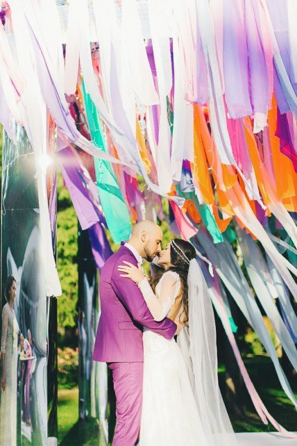 Свадьба Ирины и Никиты — это лавандовая классика с рустикальными нотками. В таком же духе была выполнена и свадебная арка — на конструкцию из деревянных блоков красиво накинули отрез ткани, который был декорирован гирляндой из лампочек. Ребята хотели уйти от идеи с живыми цветами, и у них это получилось!