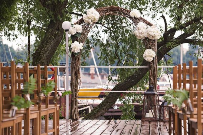 Свадьба на природе может быть дополнена оригинальной плетеной аркой круглой формы. Обычно ее выполняют из связанных между собой прутьев. Иногда используется жесткий деревянный каркас.