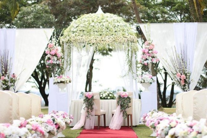 Огромную роль в оформлении залов, открытых площадок играют цветы свадебных арок. Традиция создавать потрясающие альтанки, шатры и беседки пришла к нам от индусов, из Древнего Египта и Греции.